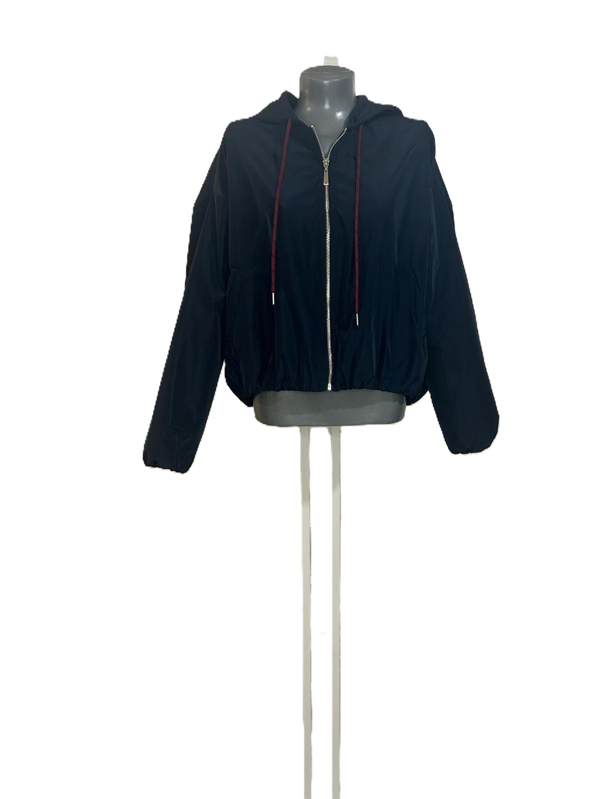 Chaqueta de manga larga con cierre frontal, puños elásticos y bajo fruncido. Incluye capucha con cordones rojos que aportan un toque de contraste. Versátil y cómoda, perfecta para looks urbanos o casuales.