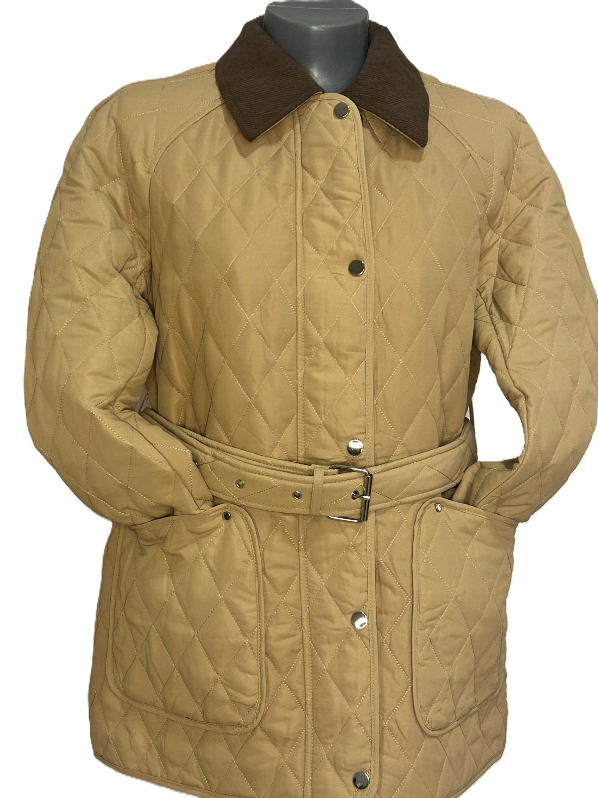 Esta prenda es un abrigo acolchado con diseño de rombos. Tiene cuello en contraste de color marrón oscuro, cierre de botones a presión al frente y un cinturón ajustable en la cintura para acentuar la figura. Su estilo es clásico y funcional, ideal para el clima frío.
