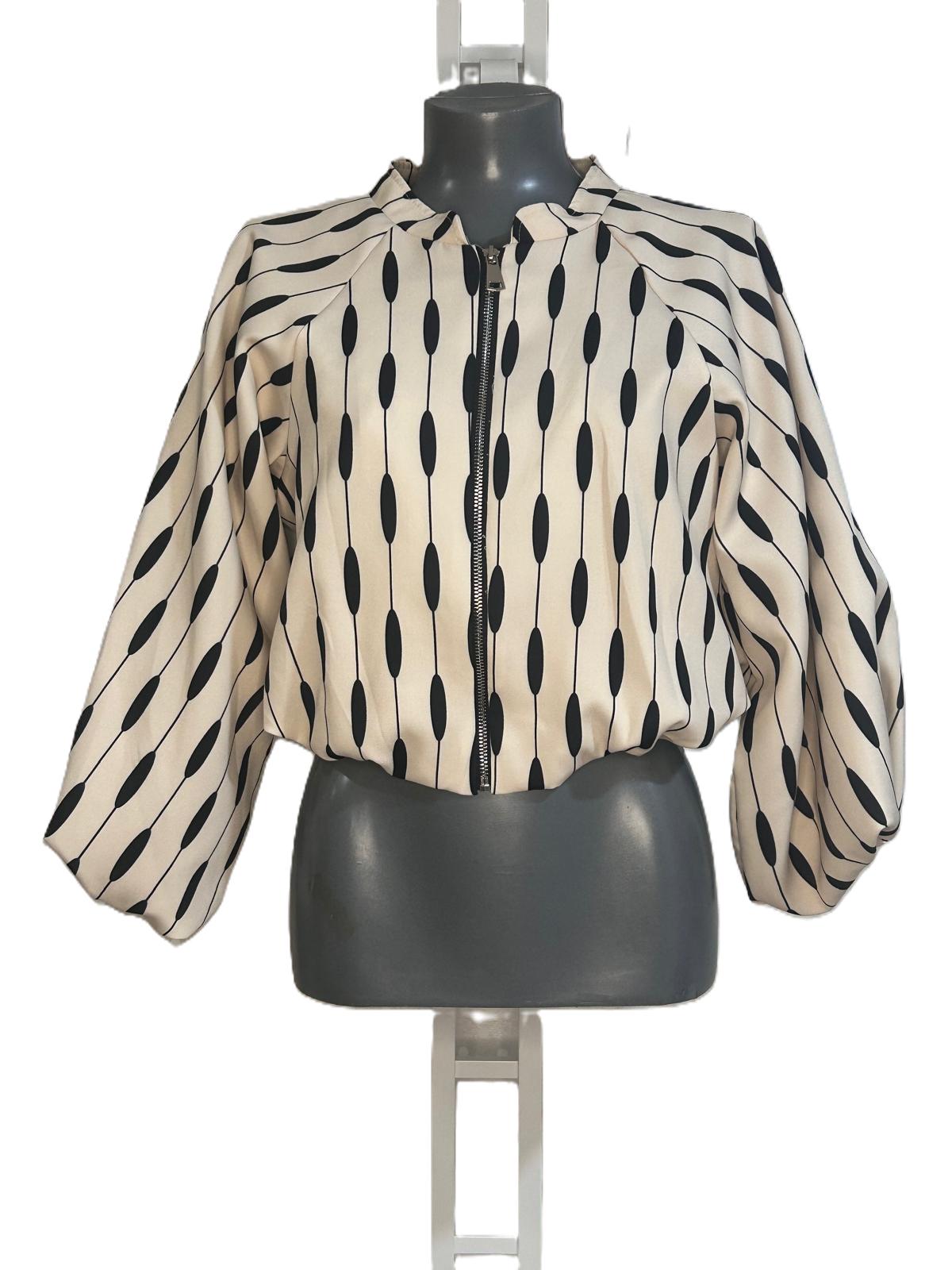Chaqueta corta con estampado gráfico . Destaca por sus mangas globo y cierre frontal con cremallera, combinando volumen y diseño moderno para un look audaz y artístico.