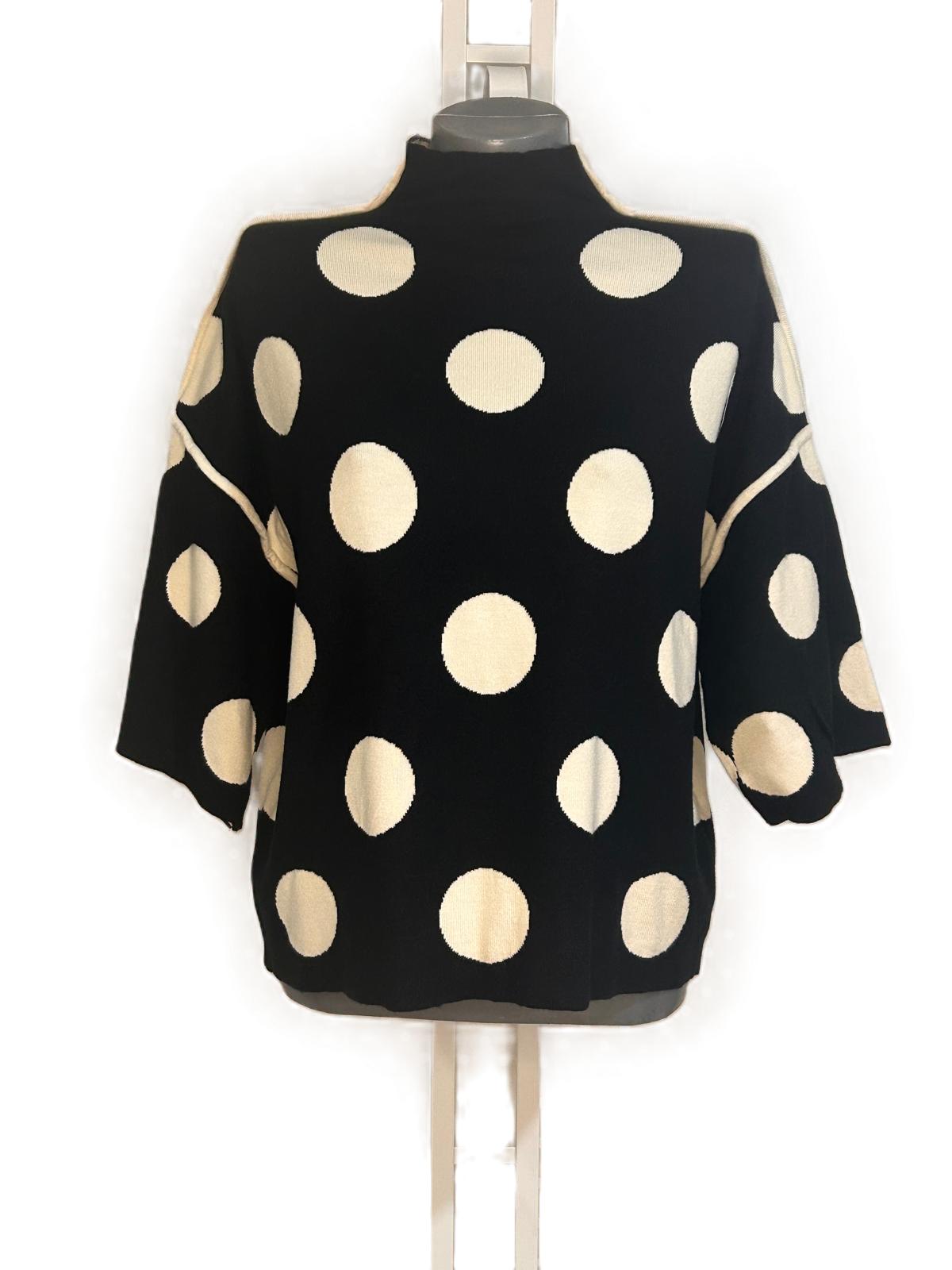Jersey negro con grandes lunares blancos distribuidos de forma uniforme. De corte relajado y mangas tres cuartos, combina un diseño clásico con un estilo moderno y llamativo. Ideal para looks casuales con un toque divertido.