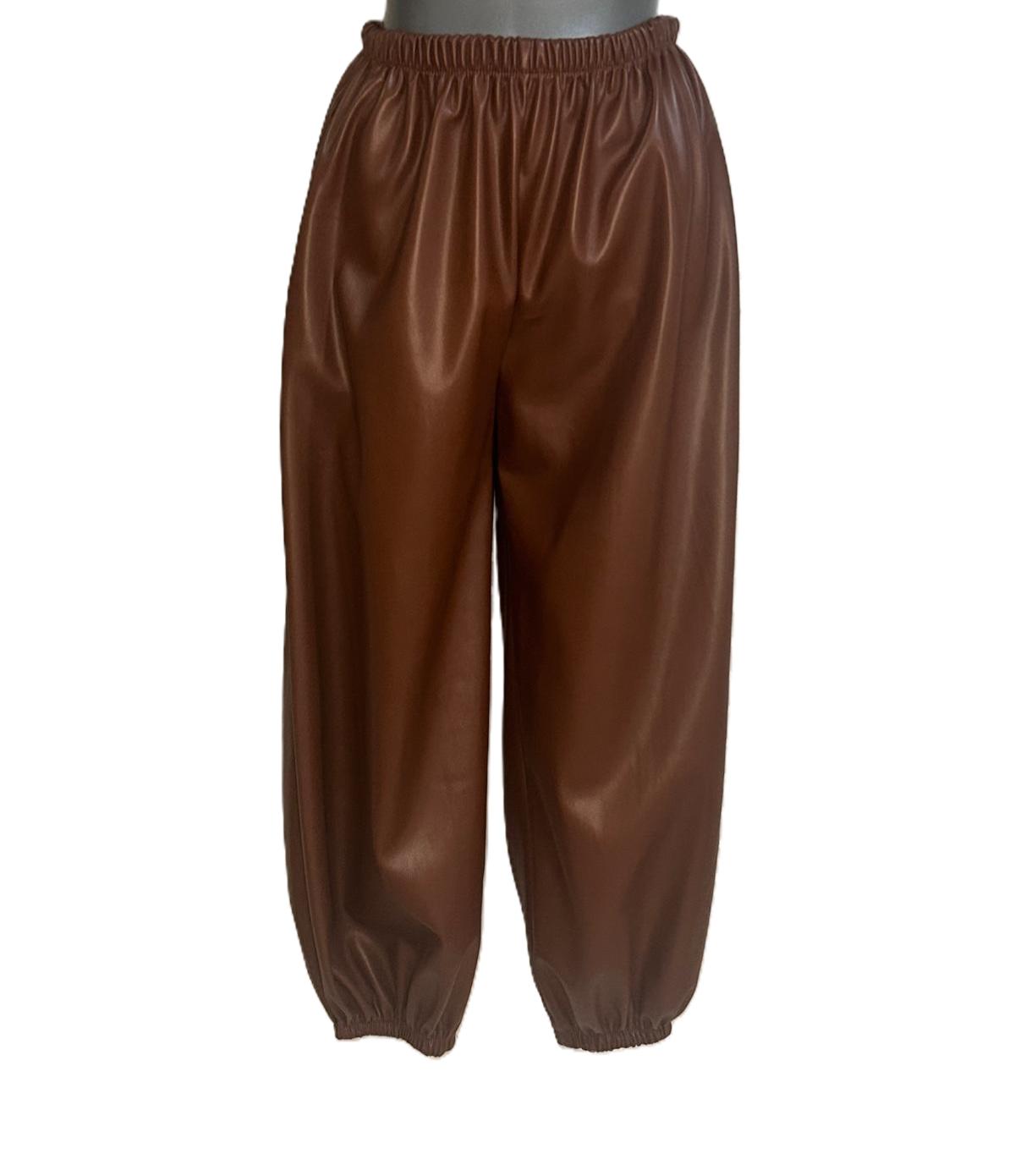 Pantalón efecto cuero con acabado brillante. Diseño amplio tipo jogger, con cintura y tobillos elásticos para mayor comodidad y estilo urbano.