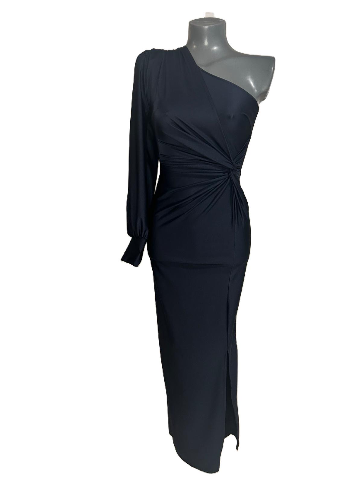 Vestido asimétrico de un solo hombro y manga larga, con fruncido en la cintura que realza la figura. De corte midi con abertura lateral, combina elegancia moderna y estilo sofisticado para ocasiones especiales.