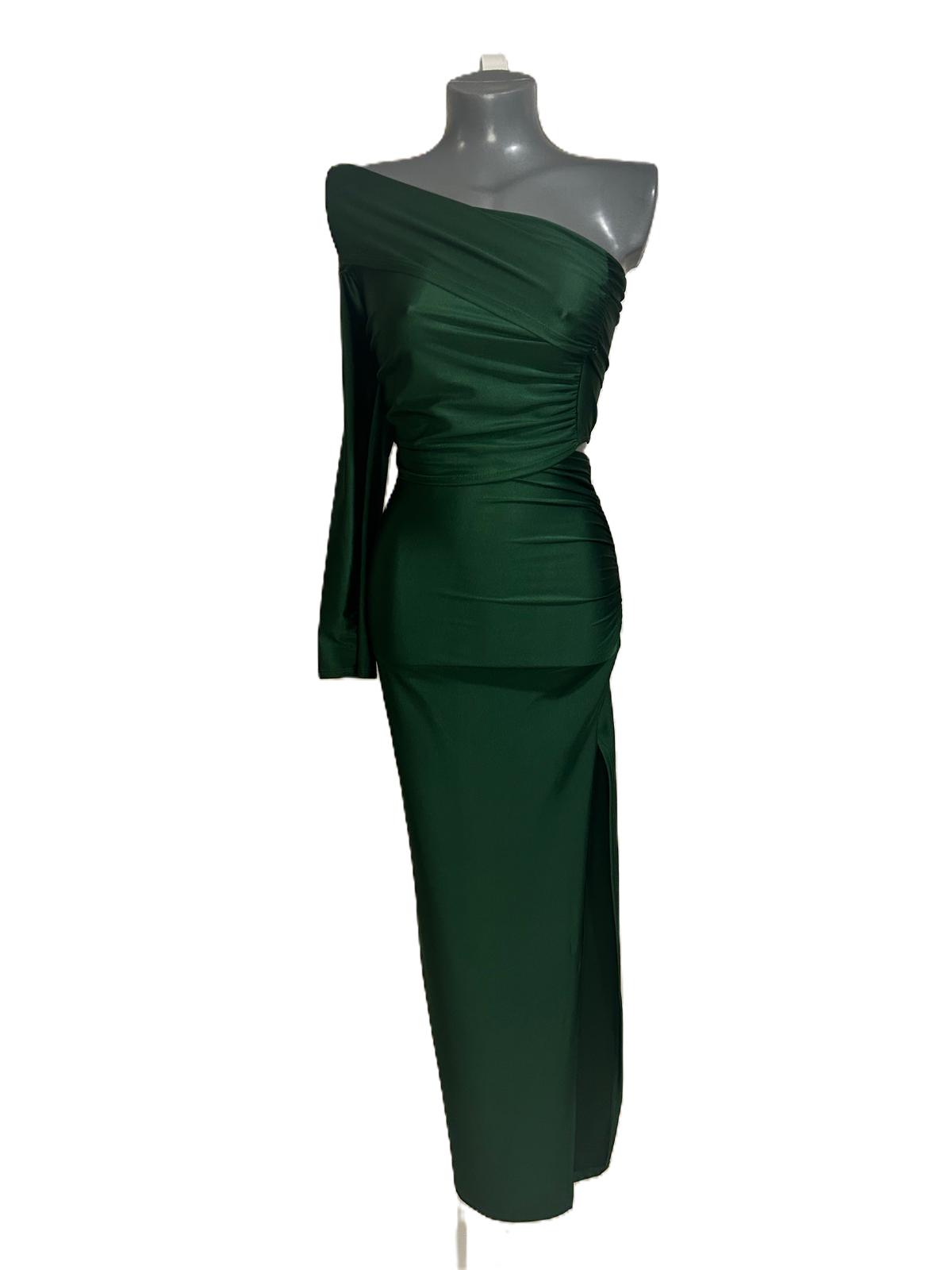Vestido de gala con diseño asimétrico de un solo hombro y manga larga. El fruncido en el cuerpo realza la silueta, mientras la falda larga con abertura aporta movimiento y sofisticación para ocasiones especiales.