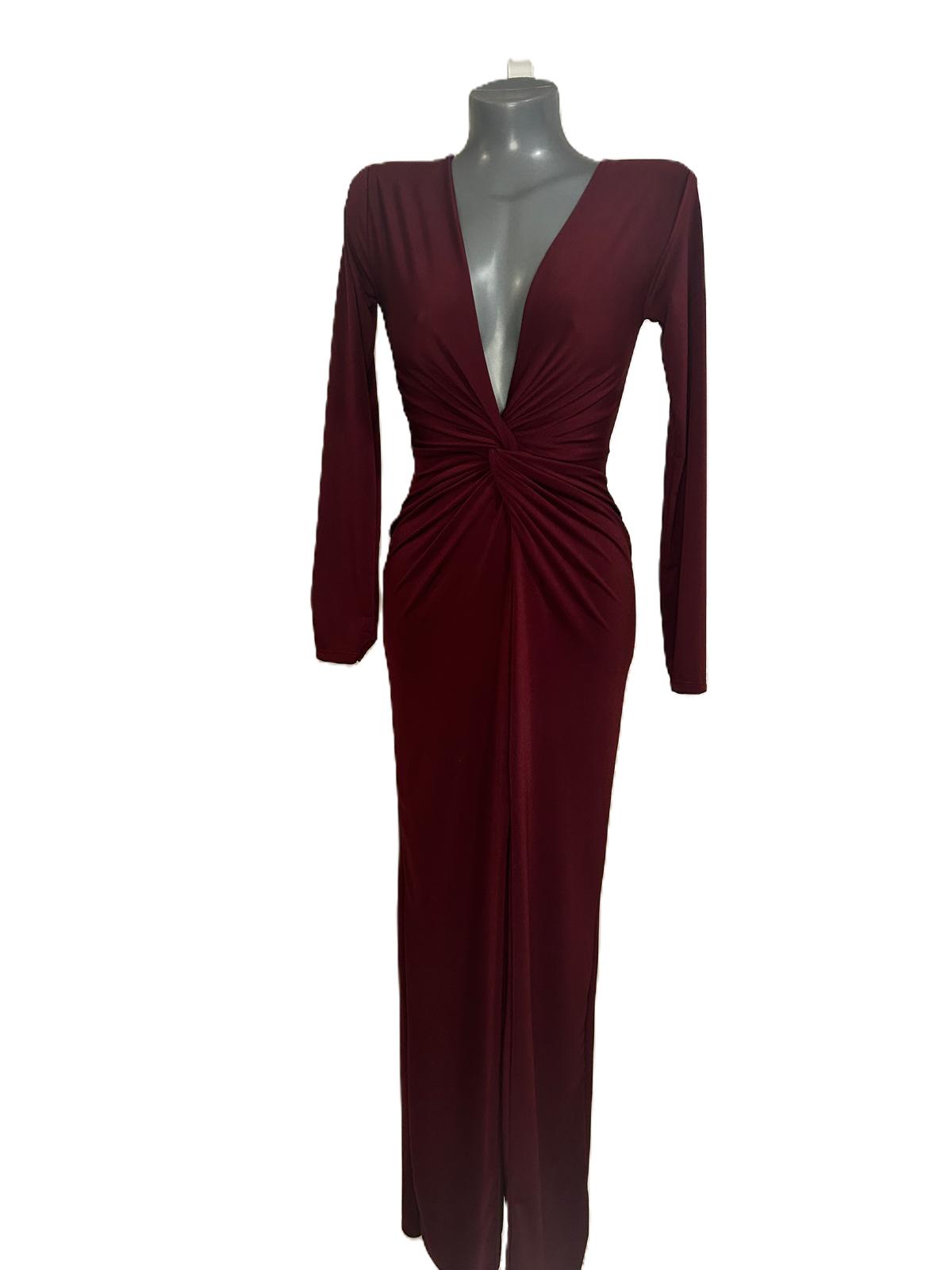 Vestido largo con escote en V profundo y mangas largas. El diseño fruncido en la cintura estiliza la figura, mientras el tejido fluido aporta movimiento y elegancia. Ideal para eventos formales con un toque sofisticado.