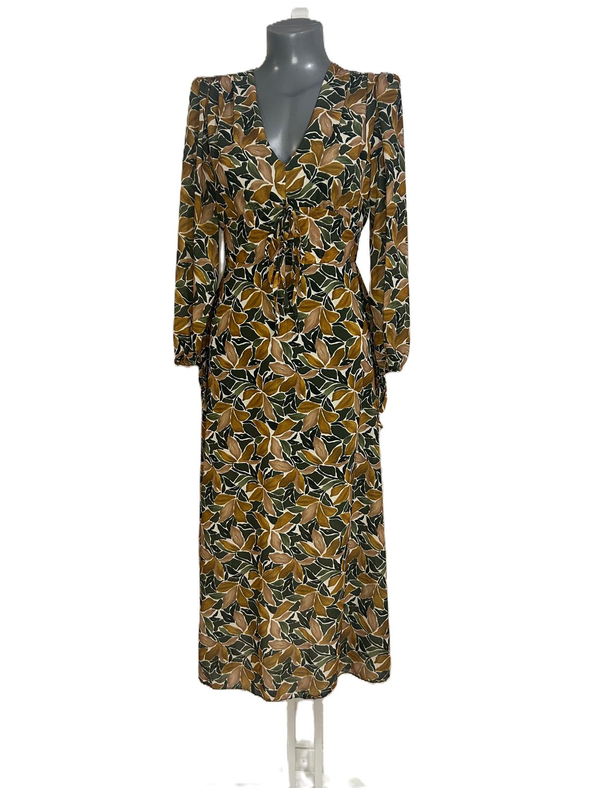 Vestido de manga larga con escote en V y cinturón a juego que define la figura. Su estampado botánico en tonos otoñales que lo convierte en una pieza vibrante y elegante, ideal para looks casuales o semi-formales.