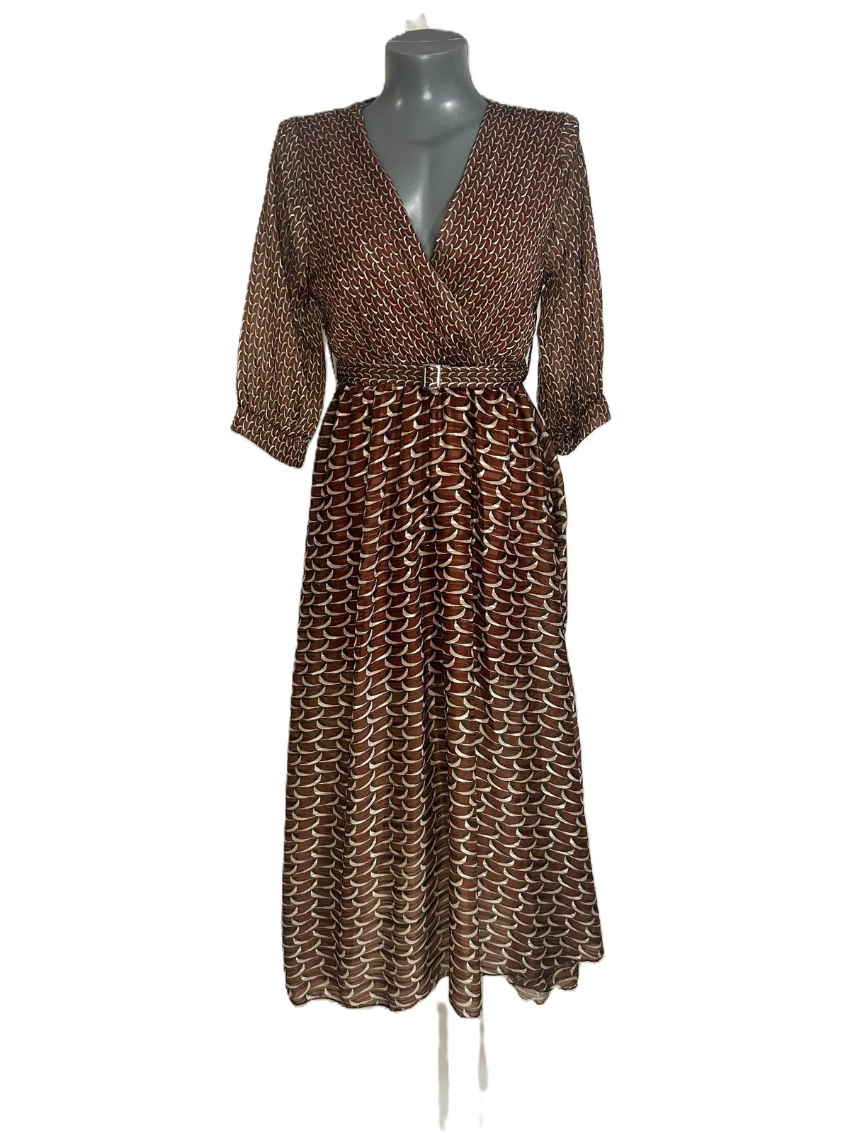 Vestido de manga larga con escote en V y cinturón a juego que define la silueta. Su diseño envolvente y patrón estampado lo hacen ideal para looks elegantes y versátiles.